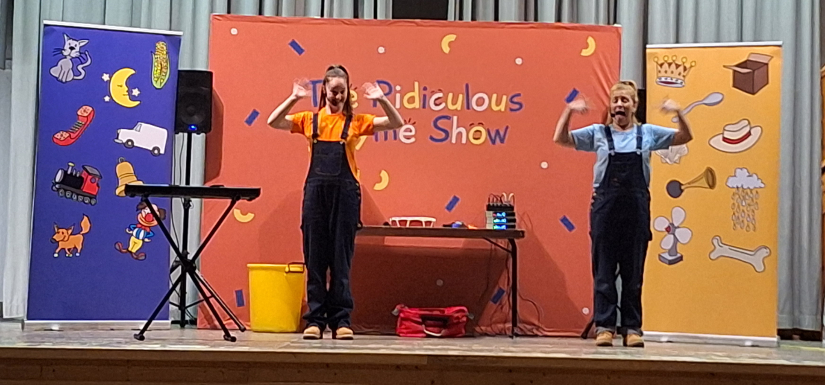 Englisch-Show – Ein besonderer Tag für unsere Grundschule Heute am 9. Dezember 2025 war ein ganz besonderer Tag für unsere Schülerinnen und Schüler: „The Ridiculous Rhyme Show“ gastierte an unserer Schule und bereitete den Kindern eine aufregende Unterrichtsstunde. Schon im Vorfeld waren alle vier Klassen voller Vorfreude und auch ein bisschen aufgeregt – schließlich würden die beiden Darsteller während der gesamten Aufführung fast nur Englisch sprechen! In den letzten Tagen hatten die Kinder fleißig wichtige Vokabeln zum Stück geübt, sodass jeder zumindest ein bisschen vorbereitet war. Doch schnell wurde klar: Man kann auch ganz ohne große Sprachkenntnisse verstehen, worum es geht. Durch die lebendige Handlung, Gestik und Mimik der Darsteller fühlten sich alle Kinder abgeholt – eine echte Erleichterung! Schon nach wenigen Minuten tauten die ersten auf, alle lachten über die lustigen Szenen und ließen sich immer mehr mitreißen von der bunten Vorstellung. Im Laufe des Stücks zeigte sich, dass die Kinder tatsächlich einiges verstanden hatten. Viele trauten sich, spontan mitzumachen oder auf die Fragen der Schauspieler zu antworten – natürlich auf Englisch! Sie suchten Reimwörter, hörten aufmerksam den Liedern zu, halfen ganz eifrig dabei einen Kuchen “zu backen”, und tanzten am Ende sogar alle gemeinsam. Die Freude und Begeisterung waren dabei spürbar. Die Veranstaltungen hat gezeigt, wie motivierend Sprache sein kann, wenn sie lebendig vermittelt wird – und mit wie viel Spaß das Lernen verbunden sein kann. Wir bedanken uns herzlich bei den beiden Darstellern für diese besondere Lerneinheit.